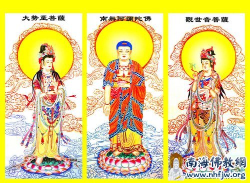 西方三圣,就是我们经常所看到的,佛像里面的阿弥陀佛、观世音菩萨和大势至菩萨,叫西方三圣。阿弥陀佛是表无量光明,无量的寿命,无量的功德。观音菩萨是表大慈悲,宇宙的大慈悲。大势至菩萨是代表喜舍。