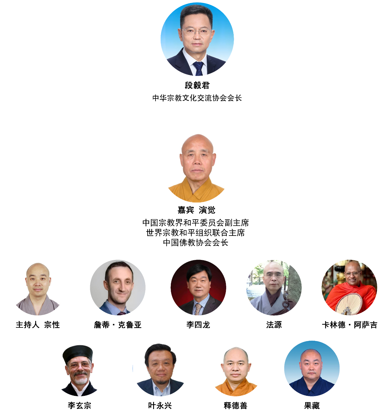 中华宗教文化交流协会会长段毅君、中国佛教协会会长演觉法师、欧洲宗教和平组织主席詹蒂·克鲁亚先生、北京大学哲学系(宗教学系)教授李四龙先生、台湾中国佛教会教育委员会主任委员法源法师、斯里兰卡科伦坡岗嘎拉玛寺首席住持卡林德·阿萨吉法师、意大利道教协会会长李玄宗道长、马来西亚华人穆斯林协会会长叶永兴先生、越南佛教教会执行委员会副主席兼秘书长德善法师、海南省佛教协会会长果藏法师等。
