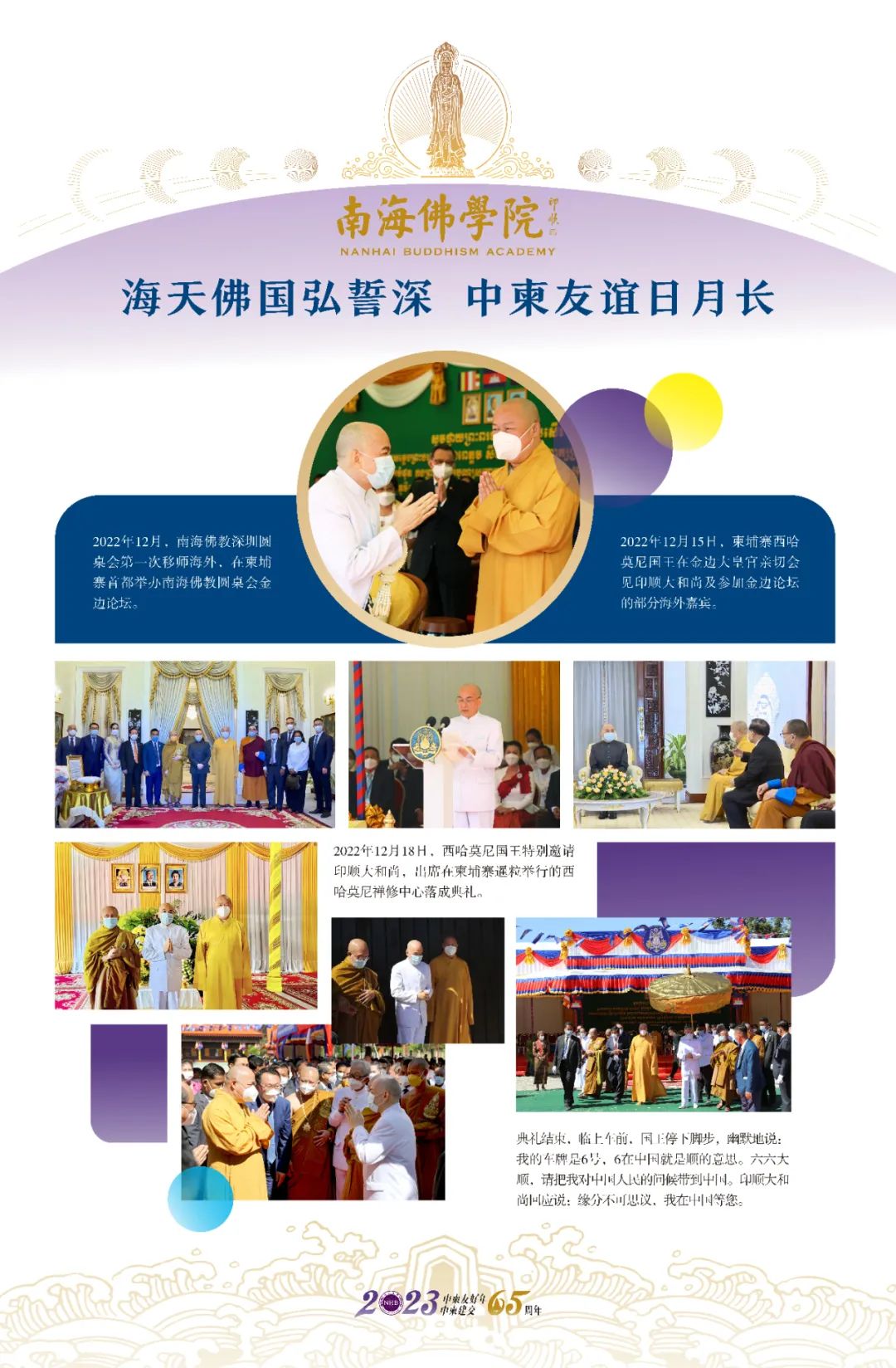 2022年12月,南海佛教深圳圆桌会第一次移师海外,在柬埔寨首都举办南海佛教圆桌会金边论坛。12月15日,西哈莫尼国王在大皇宫亲切会见印顺大和尚及部分海外嘉宾。