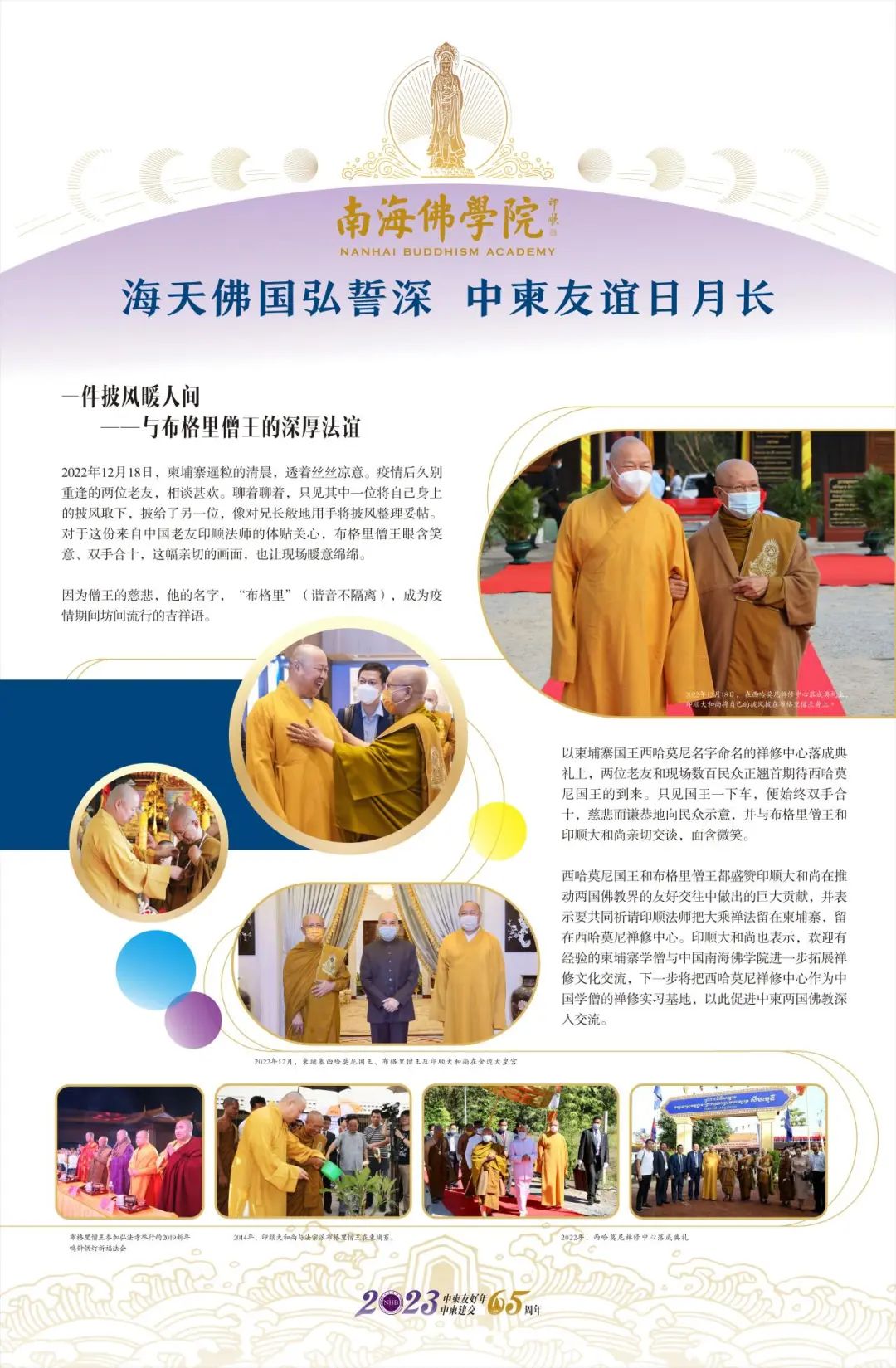 大道同行 和合共生 汇聚丝路华彩慧光 继2022年第七届南海佛教圆桌会 柬埔寨金边论坛之后 2023年12月10日至13日 第八届南海佛教圆桌会将 移师印度洋“佛法之岛” 于斯里兰卡首都举办 科伦坡论坛及系列活动 敬请期待 ▲科伦坡冈嘎拉马寺 今年是中柬建交65周年 在南海佛教圆桌会科伦坡论坛即将举办之际 我们用12集的篇幅 回顾中柬法谊走过的历程 带您走进金边论坛的高光时刻 2022年12月18日,柬埔寨暹粒的清晨,透着丝丝凉意。疫情后久别重逢的两位老友,相聊甚欢。聊着聊着,只见其中一位将自己身上的披风取下,披给了另一位,像对兄长般地用手将披风整理妥帖。 对于这份来自中国老友印顺法师的体贴关心,布格里僧王眼含笑意、双手合十,这幅亲切的画面,也让现场暖意绵绵。因为僧王的慈悲,他的名字,“布格里”(谐音不隔离),成为疫情期间坊间流行的吉祥语。 以柬埔寨国王西哈莫尼名字命名的禅修中心落成典礼上,两位老友和现场数百民众正翘首期待西哈莫尼国王的到来。只见国王一下车,便始终双手合十,慈悲而谦恭地向民众示意,并与布格里僧王和印顺大和尚亲切交谈,面含微笑。 西哈莫尼国王和布格里僧王都盛赞印顺大和尚在推动两国佛教界的友好交往中做出的巨大贡献,并表示要共同祈请印顺法师把大乘禅法留在柬埔寨,留在西哈莫尼禅修中心。 印顺大和尚也表示,欢迎有经验的柬埔寨学僧与中国南海佛学院进一步拓展禅修文化交流,下一步将把西哈莫尼禅修中心作为中国学僧的禅修实习基地,以此促进中柬两国佛教深入交流。 ▲2016年博鳌论坛 2016年和2017年,布格里僧王作为南传佛教代表,参加博鳌亚洲论坛宗教分论坛。他说,博鳌亚洲论坛宗教分论坛是一个具有国际影响力的高端论坛,通过此平台,为两国的世代交好注入了新能量。 从2016年开始,布格里僧王连续参加了四届南海佛教深圳圆桌会,并在2022年南海佛教金边论坛上发表主题演讲。他由衷感谢中国倡议的“一带一路”惠及了世界,并表示愿为世界文明的交流互鉴贡献宗教智慧,展现大爱担当。 ▲2016 年,印顺大和尚会见布格里僧王,布格里僧王与南海佛学院签订合作协议。 2016年10月,印顺大和尚聘请狄旺僧王与布格里僧王担任南海佛学院顾问,同时就柬埔寨派遣优秀僧人赴南海佛学院深造达成了一致协议。疫情后,这项计划已开始实施,中柬两国的佛教文化和学术交流将不断深化。