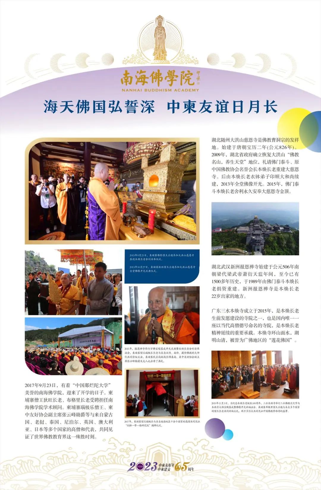 大道同行 和合共生 汇聚丝路华彩慧光 继2022年第七届南海佛教圆桌会 柬埔寨金边论坛之后 2023年12月10日至13日 第八届南海佛教圆桌会将 移师印度洋“佛法之岛” 于斯里兰卡首都举办 科伦坡论坛及系列活动 敬请期待 ▲斯里兰卡冈嘎拉马寺 今年是中柬建交65周年 在南海佛教圆桌会科伦坡论坛即将举办之际 我们用12集的篇幅 回顾中柬法谊走过的历程 带您走进金边论坛的高光时刻 中柬友谊、佛教法谊源远流长。早在5世纪至6世纪,就有柬埔寨僧伽婆罗、曼陀罗、须菩提先后来到中国传经弘法,至今菩提深种,法雨天华。 ▲摄于2022年12月13日,在金边本焕塔下玩耍的柬埔寨儿童。 自2013年以来,中柬两国佛教界的传统友谊进一步深化,中国佛教界多次应邀访问柬埔寨,把友谊的足迹印在湄公河畔晨钟暮鼓之中。 ▲2022年12月14日,金边乌龙山波莱波郎寺本焕塔祈福法会。 柬埔寨的僧王和内阁成员也曾多次参加南海佛教圆桌会,参访了中国深圳弘法寺、三亚南山寺、新洲报恩寺、大洪山的大慈恩寺等等,把中柬友谊的篇章谱写在中国的大江南北。 ▲2018年10月31日,南海佛教深圳圆桌会秘书处在深圳举行揭牌仪式。原柬埔寨宗教部部长恒参,以及柬埔寨、蒙古、尼泊尔、斯里兰卡、缅甸、泰国等多国高僧大德和宗教官员应邀出席仪式。 深圳弘法寺,沐浴着改革开放的阳光雨露,连续多年被评为广东省文明寺院。这是一座年轻的佛教寺院、充满希望的禅宗道场,最具活力的都市丛林。 自2013年印顺大和尚首访柬埔寨以来,在深圳举办的历届纪念本焕长老诞辰暨佛教文化节、祈福大典等系列活动,几乎都会邀请柬埔寨僧王等海内外的三传佛教高僧共同主礼法会盛典。 ▲2018年10月31日上午,在深圳弘法寺万佛殿祈愿楼广场上,正在举行弘法寺二期启用、佛像开光仪式,暨纪念本焕长老诞辰112周年祈福法会。柬埔寨大宗派狄旺僧王、法宗派布格里僧王应邀与来自中国两岸四地及世界各地的高僧共同主礼法会。 湖北随州大洪山大慈恩寺是佛教曹洞宗的发祥地,始建于唐朝宝历二年(公元826年)。2009年,湖北省政府确立恢复大洪山"佛教名山,养生天堂"地位,礼请佛门泰斗、原中国佛教协会名誉会长本焕长老重建大慈恩寺。 后由本焕长老衣钵弟子印顺大和尚续建,2013年全堂佛像开光。2015年,佛门泰斗本焕长老舍利永久安奉大慈恩寺金顶。 ▲柬埔寨都彭僧王应邀参加湖北随州大洪山大慈恩寺恭迎本焕长老舍利回山永久供奉祈福盛典。 湖北武汉新洲报恩禅寺始建于公元506年南朝梁代梁武帝萧衍天监年间,至今已有1500多年历史。 于1989年由佛门泰斗本焕长老捐资重建。新洲报恩禅寺是本焕长老22岁出家的地方。 ▲2015年9月26日,报恩禅寺举行万佛宝塔落成开光庆典暨本焕长老舍利安奉法会,柬埔寨僧王瑙极乐长老与来自汉传、南传、藏传佛教的大师们共同登坛主法,柬埔寨民宗局副局长棉桑南、柬中友好协会副主席张云峰勋爵及夫人也出席了典礼。 广东三水本焕寺成立于2015年,是本焕长老生前发愿建设的寺院之一,也是国内唯一一座以当代高僧德号命名的寺院,是本焕长老精神延续的重要承载。 本焕寺环山面水,湖明山清,被誉为广佛地区的“莲花佛国”。 ▲2016年10月21日 三水本焕寺迎请本老舍利,都彭长老、本玛•辛玛蓬长老在大雄宝殿主法。 由国家宗教事务局批准建设的南海佛学院,是世界首所圆融佛教三传、同摄四众弟子、并面向海外招生的佛学院。目前已有20名老挝留学僧和4名蒙古国留学僧在南海佛学院学习并顺利结业。2023年又迎来10名柬埔寨留学生与34名尼泊尔留学生来校学习。 ▲南海佛学院柬埔寨、尼泊尔留学生代表一行20人,10月14日由三亚出发,一路北上,感受中华禅文化,分别参访了广州光孝寺、深圳弘法寺、深圳大华兴寺、武汉宝通寺、新州报恩寺、孝感心虔寺等,历时五天,抵达随州大洪山大慈恩寺,参加2023大洪山禅文化论坛。 往期回顾点击下方标题