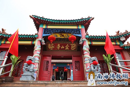 澄迈金山寺“头枕”地坡山,“脸向”长升莲花池,拾级而上,步步高升。来到寺门,先见“金山寺”门匾,而后是天王殿,最顶乃大雄宝殿如来堂。偌大的寺院,左是铜钟、金兰亭,右是鼓楼、功德坊,满院琉璃绿瓦,四周粉墙漆壁。整座金寺,依山傍水,居高临下,南渡江为玉带,南蛇岭作念珠,窥海口迎日出,眺五指山于云间,登临此寺,沃野千里,江岸碧翠,心旷神怡!